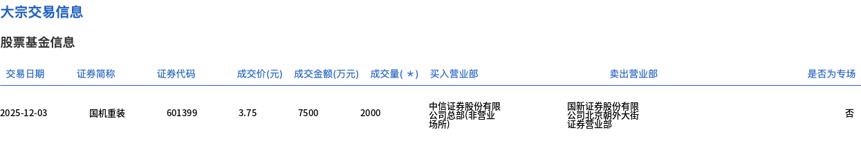 12月3日,国机重装大宗交易成交2000万股,成交额7500万元,占当日总成交额的4.33%,成交价3.75元,较市场收盘价3.83元折价2.09%。